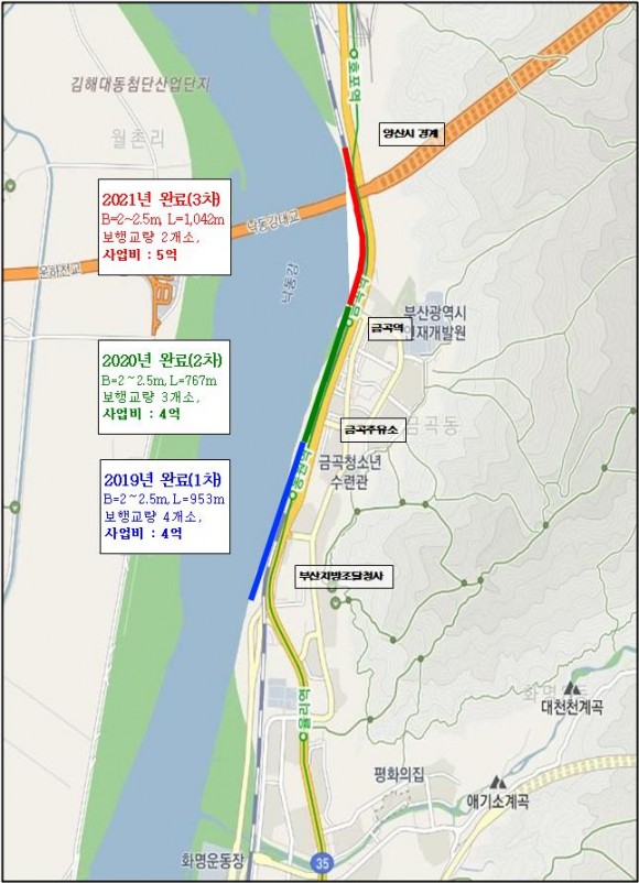 그동안 화명생태공원 금곡지역에는 낙동강살리기사업으로 조성된 국토종주 자전거도로(부산~경북 안동)밖에 없어, 자전거와 보행자가 해당 도로를 함께 이용하며 레저활동과 산책을 즐겼다.