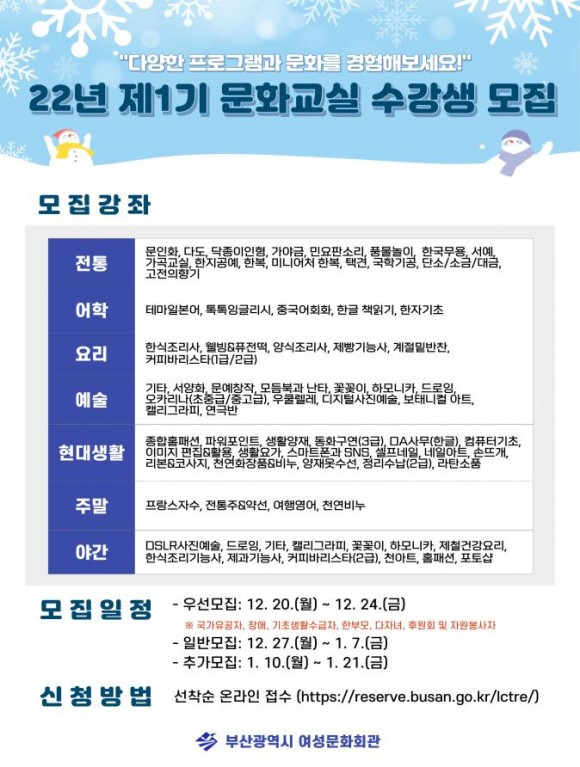 부산시 여성문화회관, 2022년 제1기 문화교실 수강생 모집