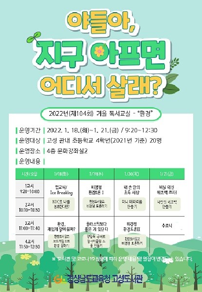 이번 독서교실은 관내 초등학교 4학년을 대상으로 1월 18일(화)부터 4일간 진행되며 「야들아, 지구 아프면 어디서 살래?」를 주제로 환경오염 문제 및 기후 변화에 대해 다룬다. 담당 사서와 각 분야 강사가 전문적이고 깊이 있는 수업을 진행할 예정이다.