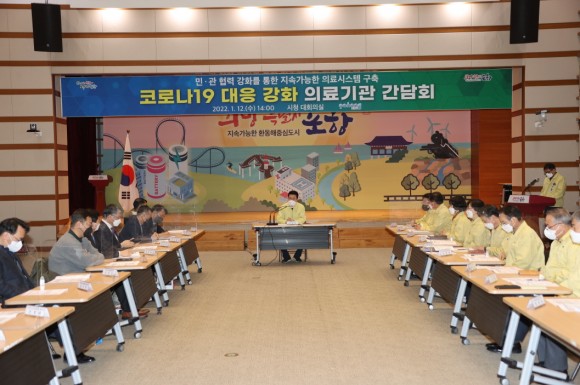 |  | | | ⓒ (주)영남도민일보 | | [영남도민일보] 홍인환 기자 = 포항시에서는 12일 오미크론 변이바이러스에 의한 확진자 증가에 대비해 방역관리 체계와 의료대응체계 전환을 위한 민관협력 강화 의료기관 간담회를 개최했다.