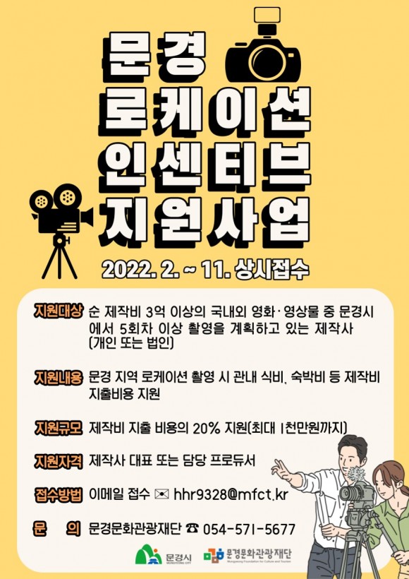 올해로 4년째 시행하는 문경 로케이션 인센티브 지원사업은 순 제작비 3억 이상의 국내외 영화·영상물 중 문경에서 5회차 이상 촬영하는 경우 숙박비, 식비, 유류비, 보조출연료, 중장비 사용료 등 문경에서 지출한 비용의 20% (최대 1천만 원)를 지원하는 사업이다.