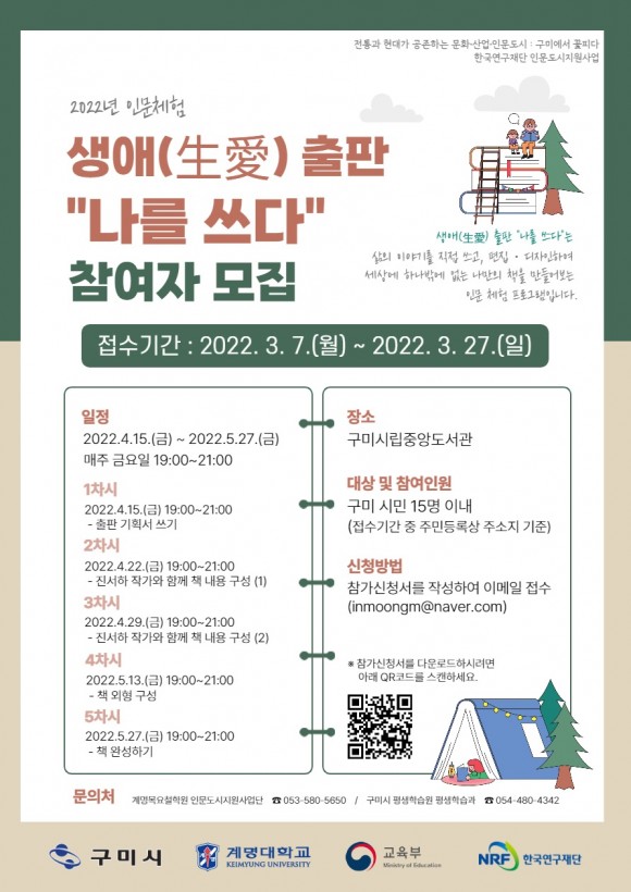 생애출판 “나를 쓰다”는 시민들이 자기 삶의 이야기를 직접 쓰고, 편집․디자인하여 세상에 하나밖에 없는 책을 만들어보는 인문체험 프로그램이다. 모집인원은 시민 15명으로 신청자격은 접수기간 중 구미시에 주소지를 둔 시민이면 누구나 가능하며, 참여를 원할 경우 참가신청서와 A4 2매 내외의 원고 1편 이상을 제출하면 심사를 통해 선발된다.