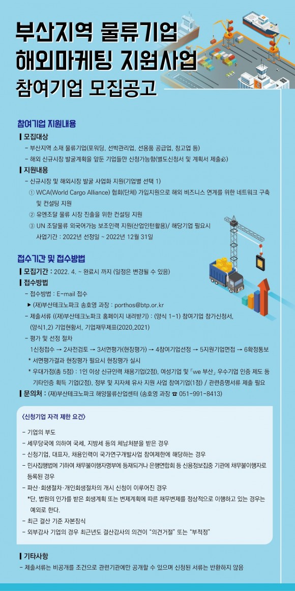 |  | | | ⓒ (주)영남도민일보 | | [영남도민일보] 영남도민일보 기자 = 부산시(시장 박형준)는 (재)부산테크노파크와 함께 「물류기업 해외마케팅 지원사업」을 추진하고, 지원사업에 참여할 기업을 모집한다고 밝혔다.