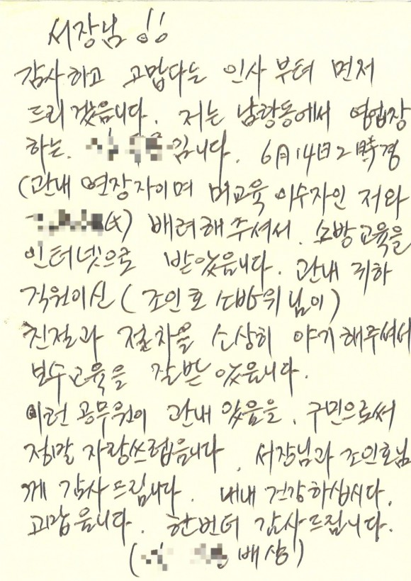 영도구 내 다중이용업소를 운영 중인 편지의 주인공 A씨(남/60대)는 “2년에 한번 다중이용업소 소방안전교육을 받아야 하는데, 나이가 많다보니 사이버교육을 이수하는 데 애로사항이 많다”며 “항만소방서 직원분이 본인 일처럼 하나하나 친절히 설명해주셔서 너무 감사했다”고 밝혔다.