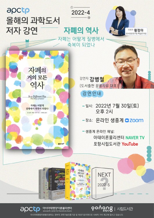 지난 5월에 진행한 3회차 강연에 이어 오는 7월 30일 오후 2시에는 4회차 강연으로 ‘자폐의 거의 모든 역사’(부제 : 자폐는 어떻게 질병에서 축복이 되었나)의 옮긴이인 강병철 도서출판 꿈꿀자유 대표의 강연이 황정아 한국천문연구원 책임연구원(APCTP 과학문화위원)의 사회로 진행된다.