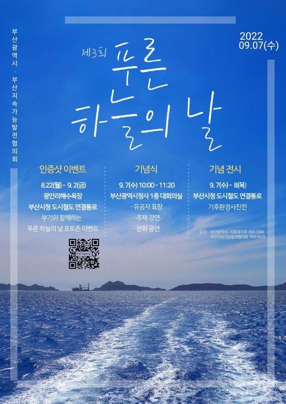 부대행사로는 광안리해수욕장과 시청에서 푸른 하늘의 날을 위한 시민생활실천을 주제로 하는 인증사진 참여 행사가 지난 2일까지 진행됐다. 추첨을 통해 행사에 참여한 50명에게 기념품을 증정하기도 했다. 이와 함께, 오늘(7일)과 8일 도시철도 시청역 연결통로에서 기상·기후 환경변화와 기후위기 관심제고를 위한 기상기후사진도 진행할 예정이다.
