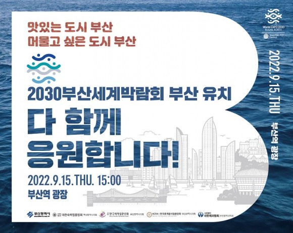 한편, 부산시와 숙박·외식·휴게·제과업 등 위생단체 4곳*은 오늘(15일) 오후 3시 부산역 광장에서 선포식을 열고, 앞으로 한 달 동안 2030부산세계박람회 유치 기원 캠페인을 대대적으로 전개한다고 밝혔다. * 대한숙박업중앙회부산시지회, 한국외식업중앙회부산시지회, 한국휴게업중앙회부산시지회, 대한제과협회부산시지회