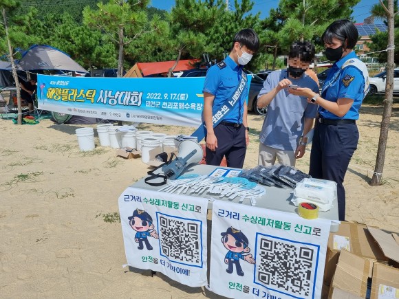 |  | | | ↑↑ ▲태안해양경찰서는 이달 17일(토), 태안 천리포해수욕장 일원에서 근거리 수상레저활동 신고 활성화를 위한 캠페인을 진행했다. / 출처=태안해양경찰서 | | ⓒ (주)영남도민일보 | | [영남도민일보] 영남도민일보 기자 = 태안해양경찰서(서장 김석진)는 이달 17일, 천리포해수욕장 일원에서 ‘근거리 수상레저활동 신고 활성화를 위한 캠페인’을 진행했다고 밝혔다. 이날 태안해경은 충청남도에서 주관하는 해양플라스틱 사냥대회에 참가한 카약 활동자를 대상으로, 출항 전 안전교육과 더불어 손쉬운 근거리 신고를 위한 홍보물을 배부하고 신고방법을 시연하는 등 캠페인을 진행했다.