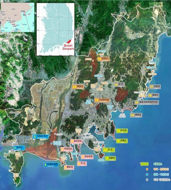 * 유네스코 세계지질공원 신청 명소(20개 명소) : 눌차도·낙동강 하구·다대포 해변·몰운대·두송반도·두도·암남공원·송도반도·태종대·조도·오륙도·이기대·해운대·송정·슈도타킬라이트·용궁사·오랑대·장산·금정산·백양산·구상반려암