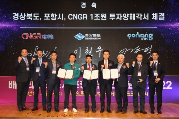 |  | | | ⓒ (주)영남도민일보 | | [영남도민일보] 홍 인환 기자 = 포항시가 에코프로, 포스코케미칼, GS건설 등 국내 이차전지분야 앵커기업 유치에 이어 세계 전구체 시장 1위 기업인 중국 CNGR 투자유치로 글로벌 배터리 선도도시로 힘찬 도약을 하고 있다. 포항시와 경상북도는 24일 포스코국제관 국제회의장에서 CNGR과 1조 원 규모의 대규모 투자양해각서 체결식을 가졌다. 체결식은 배터리 선도도시 포항 국제컨퍼런스 2022 행사와 함께 진행됐으며, 이철우 경북도지사, 이강덕 포항시장, CNGR 덩 웨이밍 회장과 타오우 수석부회장, 백인규 포항시의회 의장, 박용선 경상북도의회 부의장 등 내·외빈 200여 명이 참석했다.