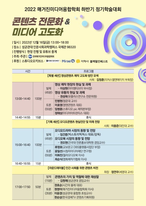 미디어 기업 및 콘텐츠 시장 차원에서 오디오콘텐츠는 새로운 고객 발굴 및 비즈니스 개척으로 블루오션 영역으로 떠오르고 있다. 이에 오디오 콘텐츠에 대한 현실 진단 및 미래 전망을 통해 오디오 콘텐츠 시장 활성화 조건을 탐색하고자 이용준 대진대 교수의 사회로, 2개의 주제 발제가 이뤄진다.
