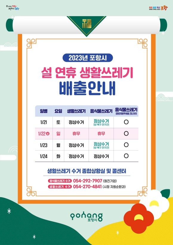 |  | | | ↑↑ 설 연휴 생활 쓰레기 배출 안내 홍보자료 | | ⓒ (주)영남도민일보 | | [영남도민일보] 홍 인환 기자 = 포항시가 설 연휴를 앞두고 ‘설맞이 생활 쓰레기 종합관리대책’을 마련해 시민 불편 해소에 나선다.