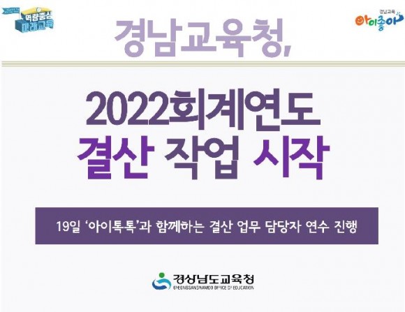 |  | | | ⓒ (주)영남도민일보 | | [영남도민일보] 영남도민일보 기자 = 경상남도교육청(교육감 박종훈)은 19일 본청, 교육지원청, 직속 기관 등 53개 기관과 부서 결산 업무 담당자 80여 명을 대상으로 연수를 한 뒤 2022회계연도 결산작업을 시작한다고 밝혔다.