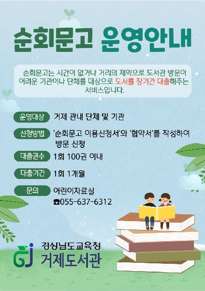 |  | | | ⓒ (주)영남도민일보 | | [영남도민일보] 영남도민일보 기자 = 경상남도교육청 거제도서관(관장 박금미)은 시간적·거리적 제약이 있는 지역주민들에게 도서 이용의 편의성을 제공하고자 순회문고를 운영한다.