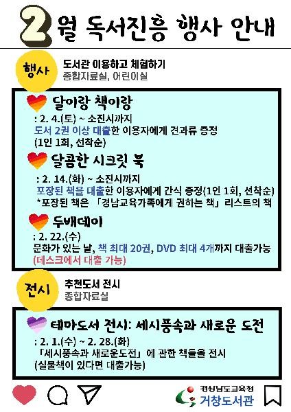 주요 행사로 ▲2월 5일 정월대보름을 맞이해 책을 대출하면 부럼을 깨는 「달이랑 책이랑」 ▲밸런타인데이를 맞이하여 포장된 비밀의 책을 대출하면 간식을 받는「달콤한 시크릿 북」을 운영하며 한 달간 진행되는 행사로는 ▲2월 세시 풍속과 2023년을 맞이하여 새로운 도전과 결심을 도와주는 책들을 추천하고 전시하는「테마도서전시」등 독서를 독려하고 흥미를 돋우는 독서 진흥 행사를 운영한다.