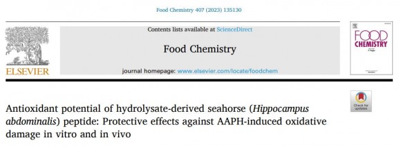 |  | | | ↑↑ ▶ 저널 논문 게재 자료 | | ⓒ (주)영남도민일보 | | [영남도민일보] 영남도민일보 기자 = 국립해양생물자원관(관장 최완현)은 최근 양식 해마류 ‘빅벨리해마’ 유래 펩타이드가 라디칼 소거 효능을 통한 항산화 활성이 있음을 발견하고, 1월 국제 최고 권위지인 식품학 학술지 ‘Food Chemistry’* 온라인판에 논문을 게재하였다고 밝혔다. * Food Chemistry, Antioxidant potential of hydrolysate-derived seahorse (Hippocampus abdominalis) peptide: Ptotective effects against AAPH-induced oxidative damage in vitro and in vivo, 2023, https://doi.org/10.1016/j.foodchem.2022.135130