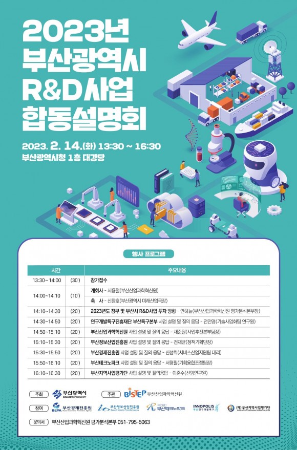 설명회는 부산산업과학혁신원에서 정부와 부산시의 연구개발(R&D) 방향에 대한 설명에 이어, 6개 연구개발 지원기관에서 2023년 주요 지원사업을 설명한다. 2023년의 대상 사업 수는 121개이며, 사업비는 약 1,003억 원이다.