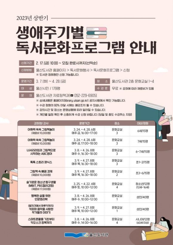 |  | | | ⓒ (주)영남도민일보 | | [영남도민일보] 영남도민일보 기자 = 울산도서관은 오는 3월 7일부터 4월 28일까지 ‘2023년 상반기 생애주기별 독서문화 프로그램’을 운영한다고 밝혔다.