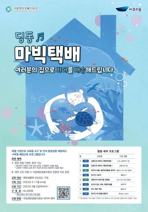 |  | | | ⓒ (주)영남도민일보 | | [영남도민일보] 영남도민일보 기자 = 국립해양생물자원관(관장 최완현)은 오는 4월부터 ‘2023년 딩동, 마빅택배’(이하 마빅택배) 운영을 시작한다고 밝혔다. 작년에 이어 두 번째로 운영되는 마빅택배는 매월 구독 가정대상 해양교육 콘텐츠를 제공하는 프로그램이다.