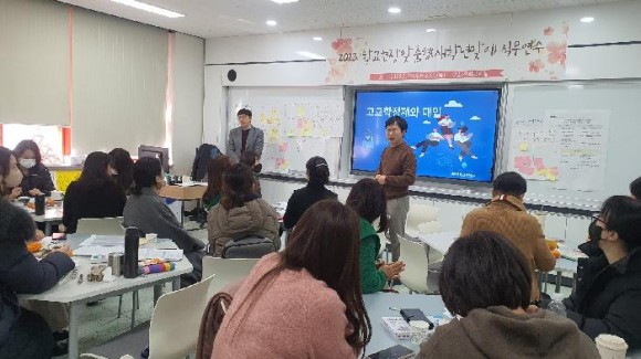 경남교육청이 ‘학교현장맞춤형 연수’ 형태로 지원하는 이 연수는 새학기가 시작되기 전에 교사들이 학교교육비전을 공유하고 교육과정 운영 방향을 심도있게 논의하는 계기가 되었다.