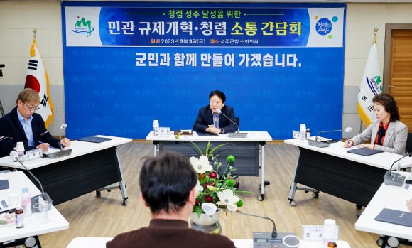 |  | | | ⓒ (주)영남도민일보 | | [영남도민일보] 영남도민일보 기자 = 성주군(군수 이병환)은 지난 3일, 관내 6개 경제 관련 협의회 회장단과 “민-관 규제개혁·청렴 소통간담회”를 개최하고 청렴서약서 작성과 함께 규제개선을 위한 현장의 목소리를 들었다.