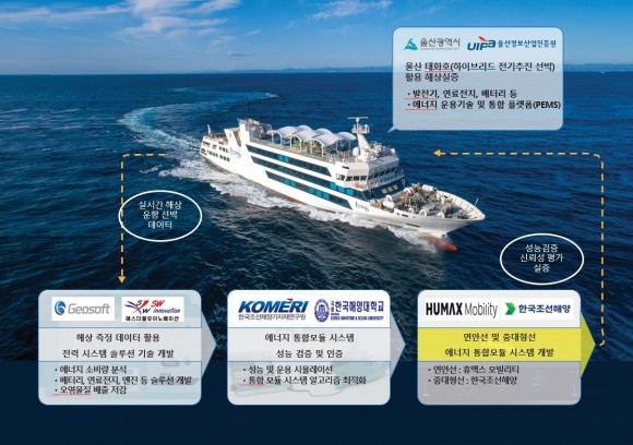 연안선은 휴맥스모빌리티, 중대형선은 한국조선해양에서 에너지 운용 기술개발 및 통합 플랫폼(PEMS)을 개발하고, 연료전지, 에너지저장시스템(ESS), 엔진, 육상충전 등의 전력 체계(시스템) 해법책(솔루션)은 지오소프트와 에스더블유(SW)이노베이션이 개발한다.