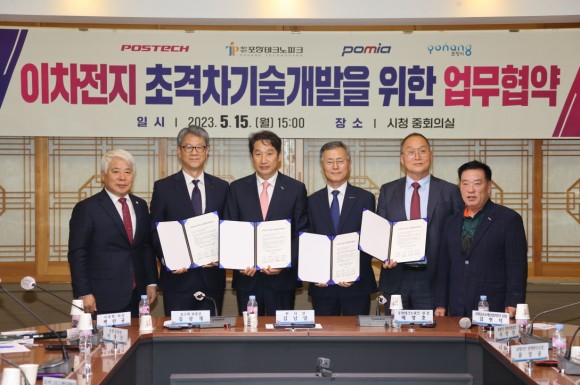 포항시는 15일 시청 중회의실에서 김남일 포항시 부시장, 백인규 포항시의회 의장, 김광재 포스텍 부총장, 배영호 포항테크노파크 원장, 김헌덕 포항금속소재산업진흥원 원장 등이 참석한 가운데 ‘이차전지 초격차 기술개발 업무협약’을 체결했다.