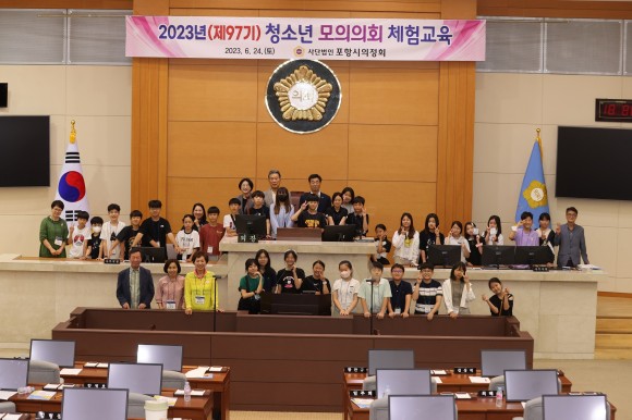(사)의정회(회장 한명희)가 주관하고 포항시와 포항시의회, 포항교육지원청이 후원하는‘청소년 모의의회 체험 교육’은 지역 내 초등 5~6학년을 대상으로 지방의회의 기능과 역할을 알리고 민주적 토론방식 및 의사결정을 직접 체험하게 함으로써 성숙한 민주시민 의식을 키우기 위해 마련됐다.