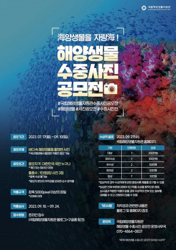 |  | | | ⓒ (주)영남도민일보 | | [영남도민일보] 영남도민일보 기자 = 국립해양생물자원관(관장 최완현)은 7월 17일(월)부터 9월 10일(일)까지 ‘2023년 해양생물 수중사진 공모전’을 개최한다고 밝혔다.