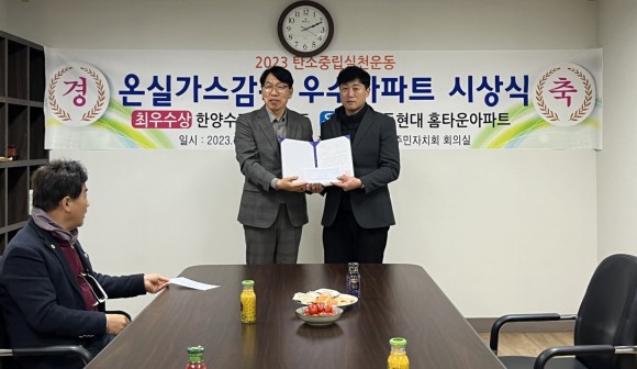이날 시상은 온실가스 진단 전후 △온실가스 감축량(전기, 도시가스, 상수도) 비교 △탄소 중립 포인트 가입률 등으로 평가해 이뤄졌으며, 한양수자인아파트가 최우수상을, 이동현대홈타운아파트가 우수상을 수상했다.