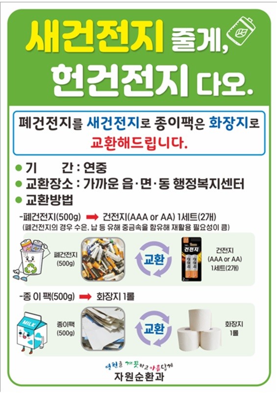 |  | | | ⓒ (주)영남도민일보 | | [영남도민일보] 박 성모기자 = 영천시(시장 최기문)는 환경오염 방지와 재활용 활성화를 위하여 폐건전지는 새 건전지로, 종이팩은 화장지로 교환해 주는 사업을 연중 지속 추진하고 있다. 교환을 원하는 시민은 보상 품목을 가까운 읍·면·동 행정복지센터에 가져가면 폐건전지(500g=20개)는 새 건전지 2개, 종이팩(500g=50개)은 화장지 1롤으로 교환받을 수 있다.