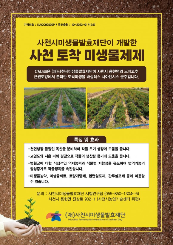‘농업용 미생물제제’ 개발제품은 2023년 용현면의 노지고추 근권토양에서 분리한 토착미생물 CMJ46으로 특허출원을 마친 상태이다.