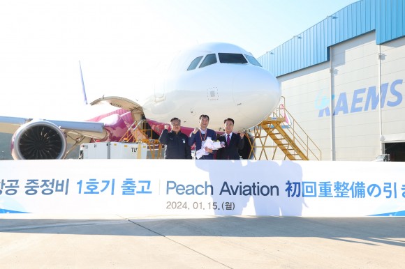 |  | | | ⓒ (주)영남도민일보 | | [영남도민일보] 영남도민일보 기자 = 사천시는 한국항공서비스(주)(KAEMS)에서 일본의 피치항공사(Peach Aviation Ltd.) 기체 중정비 1호기 출고 기념행사를 개최했다고 15일 밝혔다.
