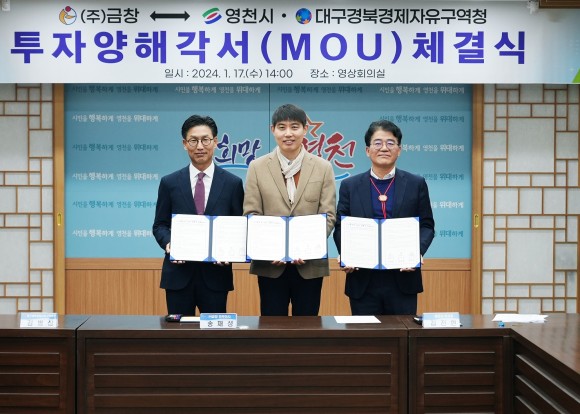 영천시(시장 최기문)는 17일 시청 영상회의실에서 영천시, 대구경북경제자유구역청, ㈜금창 관계자들이 참석한 가운데 ㈜금창의 국내복귀 투자를 성공적으로 추진하기 위한 투자양해각서(MOU)를 체결했다.