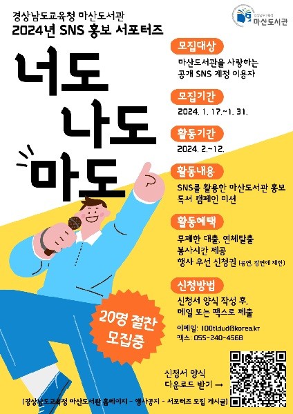 ‘너도 나도 마음에 쏙 드는 도서관’이라는 의미를 담은 ‘너도나도마도’라는 이름으로 새롭게 출발하는 홍보 서포터즈는 마산도서관을 이용하는 개인 SNS 계정 사용자는 누구나 신청 가능하며, 마산도서관 누리집-행사공지에서 신청서를 받아 담당자 업무메일로 신청하면 된다.