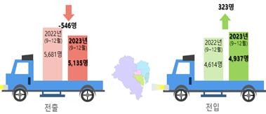 지난 4개월(2023년 9월~12월)간 ‘일자리’에 의한 전입자는 2022년 같은 기간보다 323명 증가했고, 전출자는 같은 기간 대비 546명 감소했다. 그 결과 일자리를 찾아 떠나는 순이동 규모는 2022년 동기 대비 81.4%나 줄어든 것으로 나타났다.