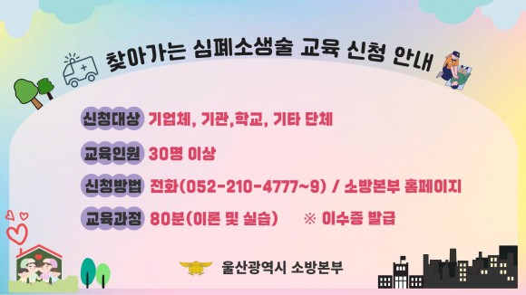 ‘찾아가는 심폐소생술 교육’은 기업체, 기관, 학교, 기타단체 30명 이상을 대상으로 하며, 울산소방본부 누리집 또는 전화(052-210-4777~9)로 신청하면 된다.