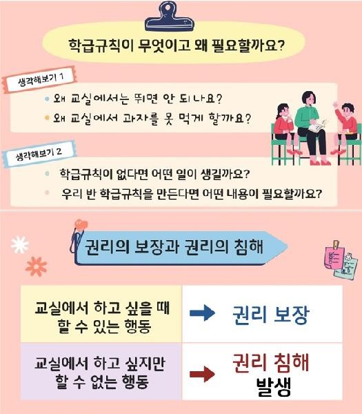 ‘학급 규칙 세우기’는 학생들이 학교생활에서 권리를 찾아보고 학교 규칙을 반영한 학급 규칙을 함께 세워봄으로써 상호 존중하는 문화를 만들고 인권을 보장하는 데 그 목적이 있다.