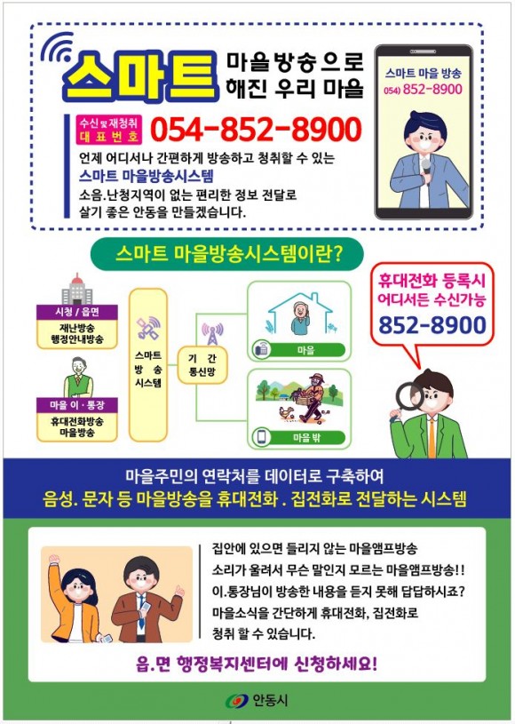 이를 통해 안동시는 정보취약지역에 있는 읍·면 전체 혹은 선택적으로 방송 및 메시지를 보낼 수 있게 됐고, 이장은 각 마을에 필요한 방송을 실시간으로 할 수 있게 됐으며, 주민은 스마트폰으로 안동시 및 마을의 필요정보를 시·공간 제약 없이 들을 수 있게 됐다.