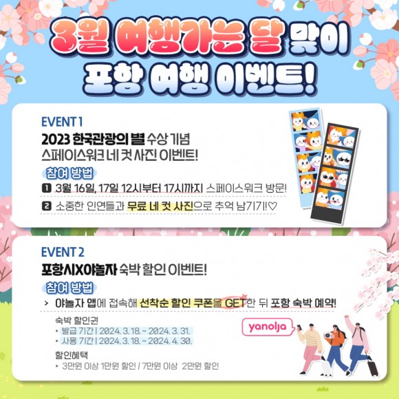 이번 이벤트는 지난 1월 포항시와 글로벌 여행 플랫폼 ㈜야놀자가 업무협약(MOU)을 체결함에 따라 포항의 벚꽃 명소를 알리고 봄시즌 포항 관광을 유도하기 위해 기획됐다.