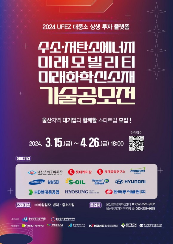 |  | | | ⓒ (주)영남도민일보 | | [영남도민일보] 영남도민일보 기자 = 울산경제자유구역청은 3월 15일부터 4월 26일까지 ‘2024년 울산경제자유구역(UFEZ) 대중소 상생 투자 기반(플랫폼) 공모전’을 개최한다고 밝혔다.
