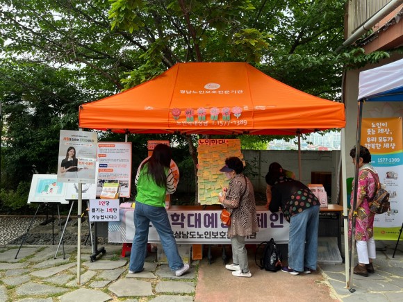 이번 캠페인은 본 기관 직원들과 대학생지킴이단 자원봉사자 2명과 함께 창원시 마산합포구에 위치한 금강노인종합복지관에서 복지관 이용 노인을 대상으로 기관 안내, 노인학대 신고번호 작성을 실시했다.