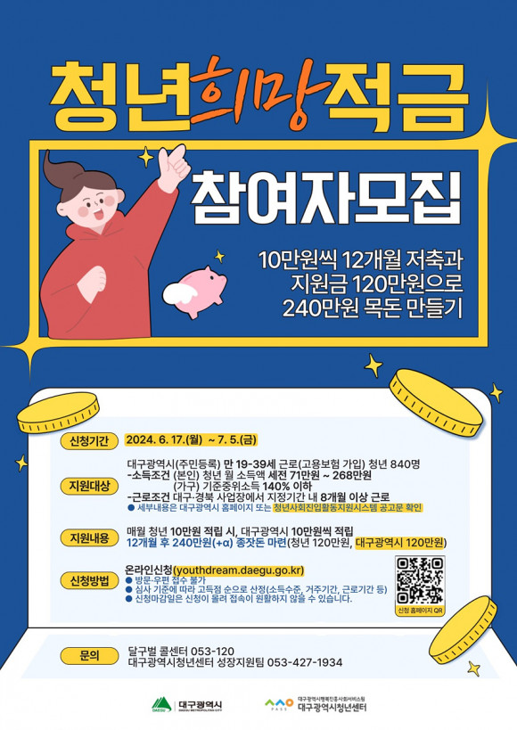 |  | | | ↑↑ 청년희망적금 요약 및 포스터 | | ⓒ (주)영남도민일보 | | [영남도민일보] 김 경주기자 = 대구광역시는 사회진입 초기의 근로청년들에게 소액자산 형성 경험과 기회를 마련해 주기 위해 ‘2024년 청년희망적금’ 사업 참여자를 모집한다.