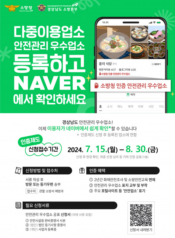 |  | | | ⓒ (주)영남도민일보 | | [영남도민일보] 영남도민일보 기자 = 경상남도 소방본부(본부장 김재병)는 2024년도 다중이용업소 안전관리 우수업소 인정 신청서 접수를 오는 8월 30일까지 다중이용업소 영업장 관할 소방서에서 접수한다고 밝혔다.