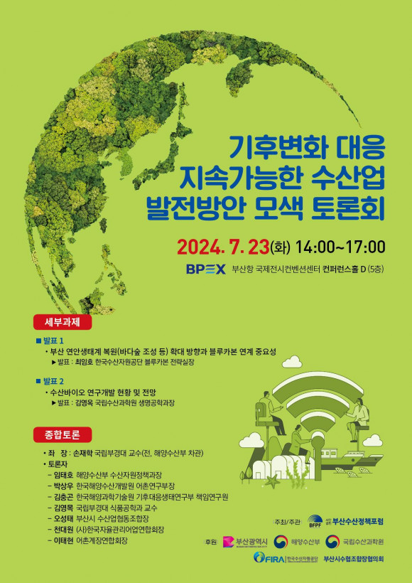 |  | | | ⓒ (주)영남도민일보 | | [영남도민일보] 영남도민일보 기자 = 부산시(시장 박형준)는 오늘(23일) 오후 2시 부산항국제전시컨벤션센터 컨퍼런스홀에서 「기후변화 대응, 수산업 발전방안 모색 토론회」가 열린다고 밝혔다. (사)부산수산정책포럼(대표이사장 류청로)이 주최하고 시가 후원한다. 심성태 시 해양농수산국장, 류청로 (사)부산수산정책포럼 대표이사장을 비롯해 수산 관련 유관기관·단체 관계자와 어업인 등 100여 명이 참석한다.