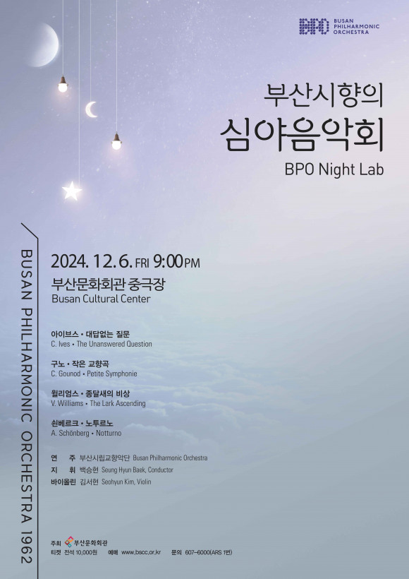 |  | | | ⓒ (주)영남도민일보 | | [영남도민일보] 영남도민일보 기자 = 부산시립교향악단 기획음악회 <부산시향의 심야음악회 BPO Night Lab> 무대가 오는 12월 6일(금) 오후 9시 부산문화회관 중극장에서 열린다.