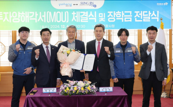 |  | | | ⓒ (주)영남도민일보 | | [영남도민일보] 홍 인환 기자 = 포항시는 지난 6일 시청 대외협력실에서 ㈜성진이앤아이와 투자유치 양해각서(MOU) 체결 및 장학금 전달식을 개최했다.