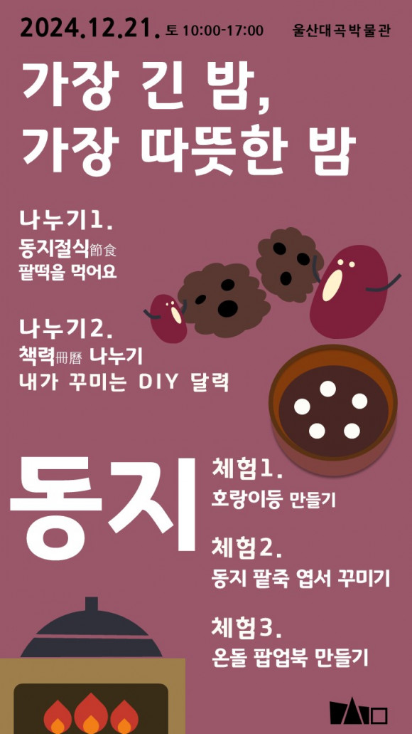 |  | | | ⓒ (주)영남도민일보 | | [영남도민일보] 영남도민일보 기자 = 울산대곡박물관은 동지를 맞아 12월 21일 오전 10시부터 오후 5시까지 2024년 동지 세시풍속 체험행사 ‘가장 긴 밤, 가장 따뜻한 밤. 동지(冬至)’를 운영한다고 밝혔다.
