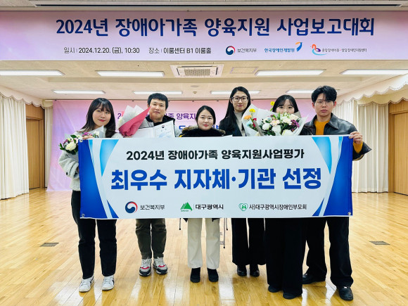 |  | | | ⓒ (주)영남도민일보 | | [영남도민일보] 김 경주 기자 = 보건복지부(한국장애인개발원)가 실시한 전국 장애아가족 양육지원사업 시행기관 현장평가에서 대구광역시와 대구시장애인부모회는 지난해에 이어 올해도 최우수 지자체 및 시행기관으로 선정돼 2년 연속 보건복지부장관상을 수상하는 영예를 안았다.