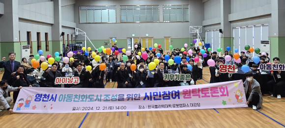 |  | | | ↑↑ 영천시는 지난 21일 한국폴리텍대학 로봇캠퍼스 대강당에서 ‘아동친화도시 조성을 위한 원탁토론회’를 개최했다고 밝혔다. | | ⓒ (주)영남도민일보 | | [영남도민일보] 박 성모 기자 = 영천시(시장 최기문)는 지난 21일 한국폴리텍대학 로봇캠퍼스 대강당에서 ‘아동친화도시 조성을 위한 원탁토론회’를 개최했다고 밝혔다.